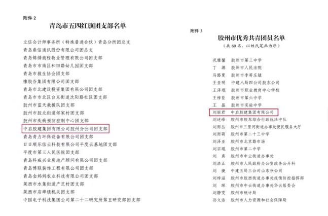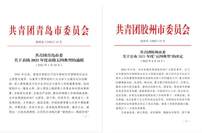 近日,喜訊頻傳,共青團青島市委、共青團膠州市委紛紛發(fā)布表彰文件,對2021年全市“五四典型”進行通報表揚。中啟膠建集團有限公司膠州分公司團支部榮獲“青島市五四紅旗團支部”稱號;中啟膠建集團華東公司團員青年職工劉麗君榮獲“膠州市優(yōu)秀共青團員”稱號。