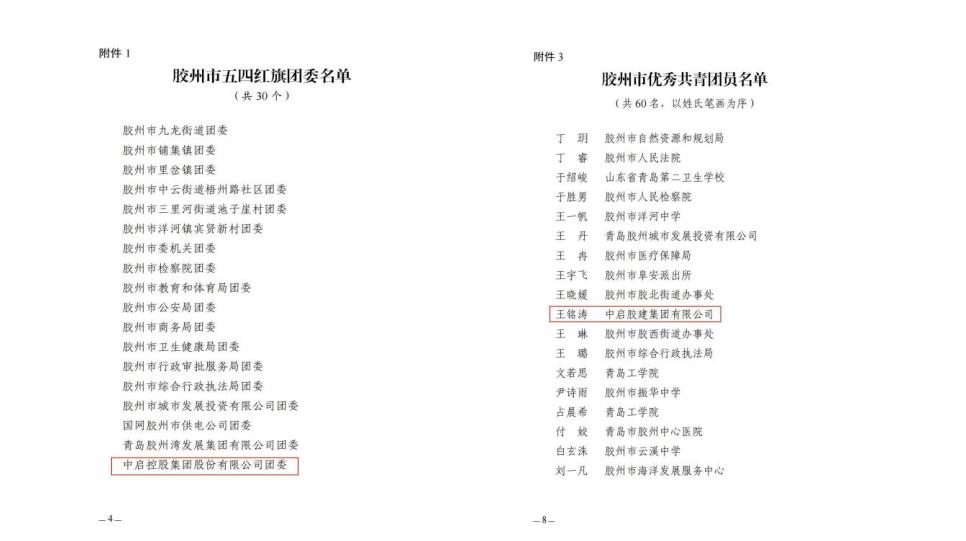 近日,膠州團(tuán)市委在市會(huì)議中心四樓多功能廳舉行“學(xué)習(xí)二十大、永遠(yuǎn)跟黨走、奮進(jìn)新征程”膠州市紀(jì)念五四運(yùn)動(dòng)104周年主題團(tuán)日活動(dòng),市委副書記劉濤出席并發(fā)表致辭,團(tuán)市委書記劉毅帶領(lǐng)全體團(tuán)員團(tuán)干部重溫入團(tuán)誓詞,會(huì)上對(duì)全市“五四典型”進(jìn)行通報(bào)表?yè)P(yáng)。中啟控股集團(tuán)股份有限公司團(tuán)委榮獲2022年度“膠州市五四紅旗團(tuán)委”稱號(hào),中啟膠建集團(tuán)膠州公司團(tuán)員青年職工王銘濤榮獲“膠州市優(yōu)秀共青團(tuán)員”稱號(hào)。