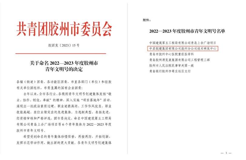 近日,共青團(tuán)膠州市委發(fā)布文件,對(duì)全市“青年文明號(hào)”進(jìn)行通報(bào)命名。中啟膠建集團(tuán)有限公司膠州分公司技術(shù)研發(fā)中心被命名“膠州市青年文明號(hào)”稱號(hào)。