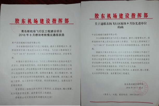 為全面推進新機場飛行區工程建設,提升工程管理水平,建設方飛行區工程部開展了“大干一百天”的勞動競賽。中啟膠建集團有限公司機場項目部憑借著優異的管理水平和全體管理人員的盡心努力,克服了所有困難,在該次勞動競賽中連續三個月取得優異成績,總排名第二名。受到了膠州機場建設指揮部的通報表揚,并作為先進單位進行了代表發言。