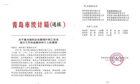 2019年,公司全面貫徹落實十九屆一中、二中、三中、四中全會精神和習近平新時代中國特色社會主義思想,認真執行和落實省局和市局有關統計工作的部署和要求,依法規范統計、不斷創新圓滿完成國家一套表、重點建筑企業生產月度報表、境外生產經營情況統計報表、行業生產經營調研等各項統計工作。榮獲青島市重點建筑業暨境外施工企業“統計工作先進集體”稱號。