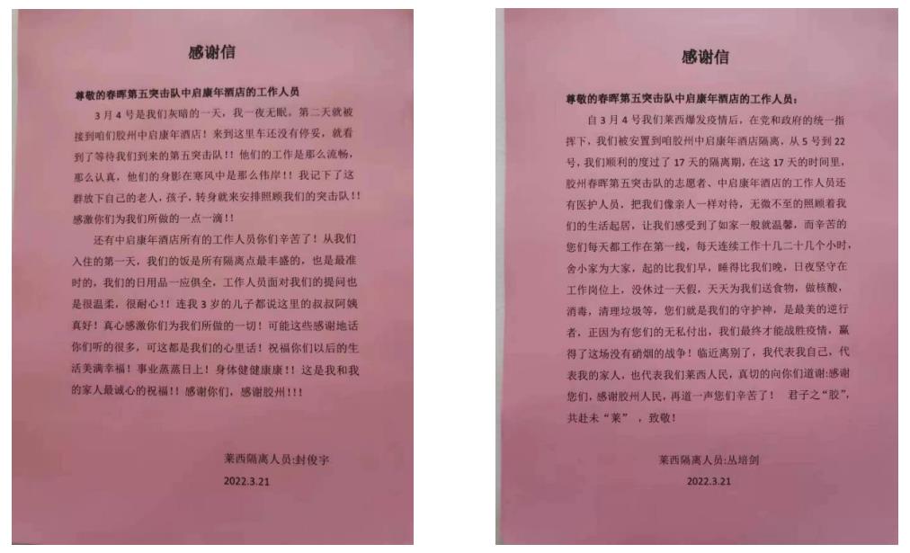 在這場持續(xù)性的抗疫行動中,中啟康年酒店始終堅守防疫第一線,積極肩負起為給隔離人員提供優(yōu)質(zhì)精細化服務(wù)的社會責任,收到了來自隔離人員及防疫突擊隊的一致好評,一封封真摯懇切的感謝信接踵而來。打贏這場“戰(zhàn)役”需要我們酒店上下一心,以實際行動配合各部門行動,認真遵循集團公司和防疫指揮部的要求,努力完成各項經(jīng)營指標以及防疫抗疫工作,爭做酒店行業(yè)模范標兵。