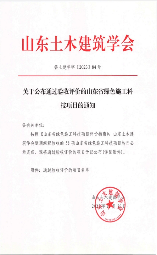 自項目立項以來,集團、分公司、項目部對該項目的綠色施工實施情況高度重視,確定了綠色施工實施方案并在項目上落實;項目定期進行自評,及時對比分析各項指標完成情況,并積極采取改進措施。通過不懈努力,該項目于2022年通過了山東省綠色施工科技項目的中期評價,并于今年11月順利通過了山東省綠色施工科技項目評價驗收。通過評價,項目達到預期制定的“五節一環?!蹦繕?,綠色施工科技示范效果良好。