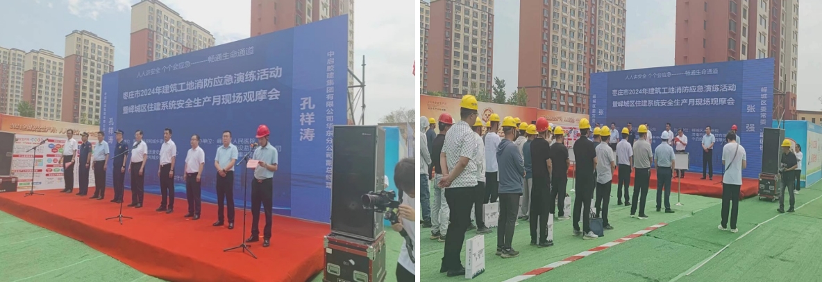 今年6月是全國第23個“安全生產月”。為深入貫徹習近平總書記關于防災減災救災重要指示精神,進一步提升建筑工地消防預警研判、響應聯動、快速處置和應急救援能力,2024年6月17日,公司在承建的嶧城區人民醫院改擴建項目舉辦棗莊市建筑工地消防應急演練活動暨嶧城區住建系統安全月現場觀摩會。嶧城區委常委、副區長張強等領導以及相關單位負責同志參加活動。