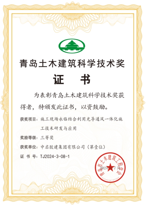 日前,在青島市土木建筑工程學(xué)會(huì)首次開展的“青島土木建筑科學(xué)技術(shù)獎(jiǎng)”評(píng)選活動(dòng)中,我公司的研發(fā)項(xiàng)目《施工現(xiàn)場永臨結(jié)合利用光導(dǎo)通風(fēng)一體化施工技術(shù)研發(fā)與應(yīng)用》榮獲三等獎(jiǎng)。