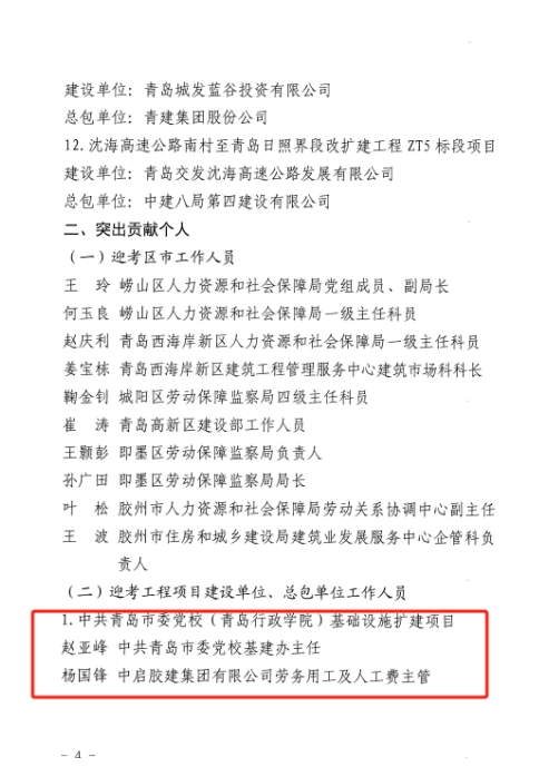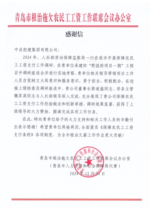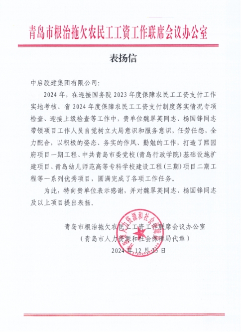 2024年,在公司領導的正確帶領下,在各單位各項目的大力支持和相關工作人員辛勤付出下,公司在保障農民工工資支付工作方面先后圓滿完成了各項調研、檢查工作并取得了優異成績。為表彰我公司在保障農民工工資支付工作方面做出的突出貢獻,青島市人社局、膠州市人社局分別向公司發來感謝信,對公司及在調研、檢查工作中做出突出貢獻的先進項目和先進個人魏翠英、楊國鋒進行通報表揚。