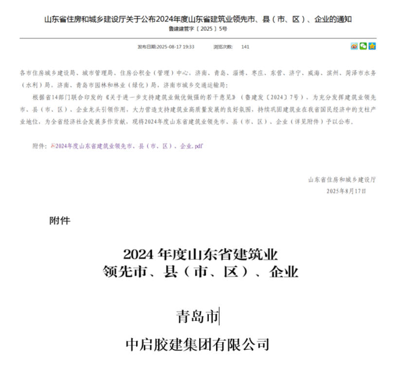 近日,山東省住房和城鄉建設廳正式公布2024年度山東省建筑業領先市、縣(市、區)、企業名單,中啟膠建集團有限公司憑借卓越的綜合實力、穩健的經營表現和突出的行業貢獻,成功入選“2024年度山東省建筑業綜合實力領先企業”。這是繼獲評“齊魯建造”品牌后,公司本年度再度斬獲的省級重磅榮譽,標志著企業在高質量發展征程中邁上新臺階!